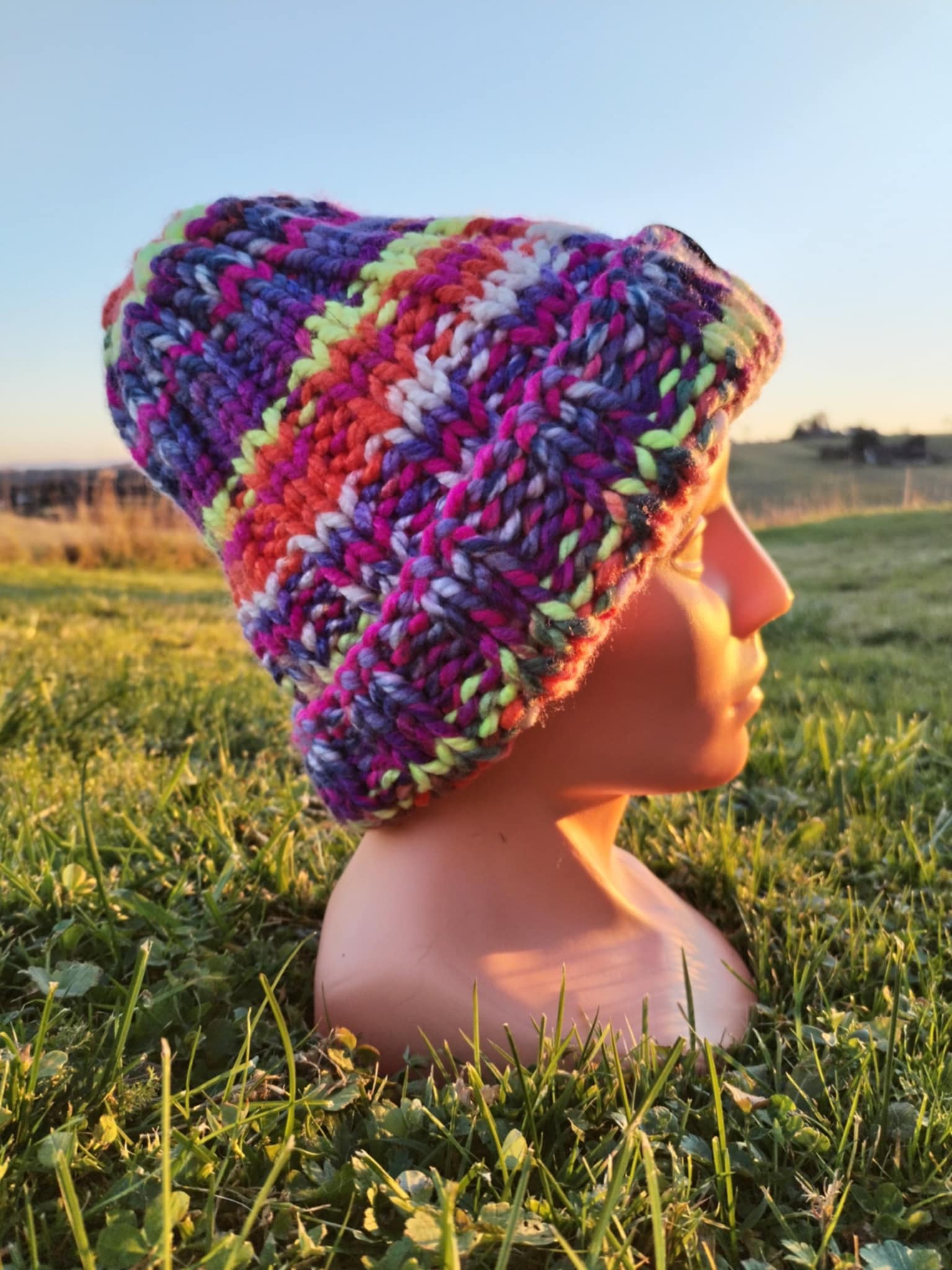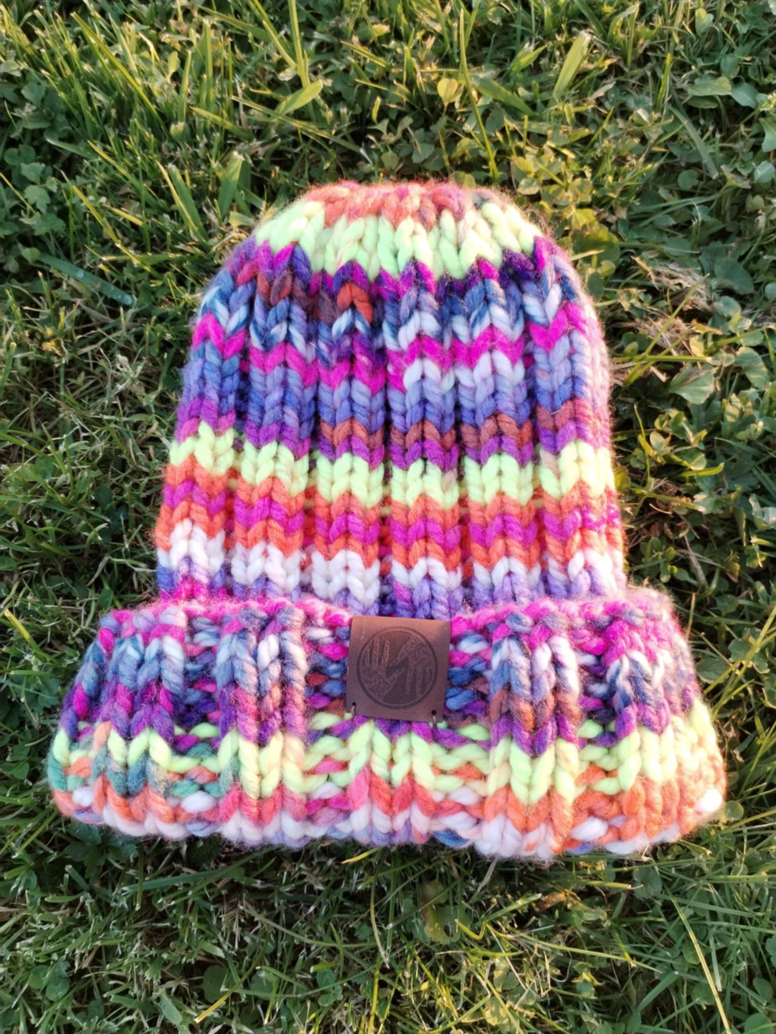 Czapka wykonana ręcznie na drutach z grubej melanżowej włóczki akrylowej w kolorze m.in. fioletu, seledynu, pomarańczu i różu. Jest miękka, mięsista, z pewnością ciepła. Będzie pasować do codziennych stylizacji, jak również do sportowych.